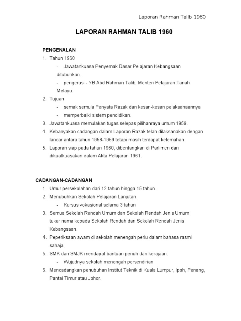 CADANGAN DALAM LAPORAN RAHMAN TALIB 1960 Bahasa Kebangsaan Bahasa Melayu berfungsi sebagai bahasa pengantar di semua peringkat sekolah iaitu SK SMK dan. Laporan Rahman Talib 1960 Akta Pelajaran 1961 Di antara beberapa perubahan dan pindaan yang dibuat dari. Analisis Laporan Rahman Talib 1960 3.